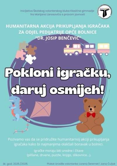 Humanitarna akcija „Pokloni igračku, daruj osmijeh“, koju smo proveli u našoj školi, uspješno je završena. Prikupljene igračke predane su Odjelu pedijatrije Opće bolnice “Dr. Josip Benčević” Slavonski Brod.